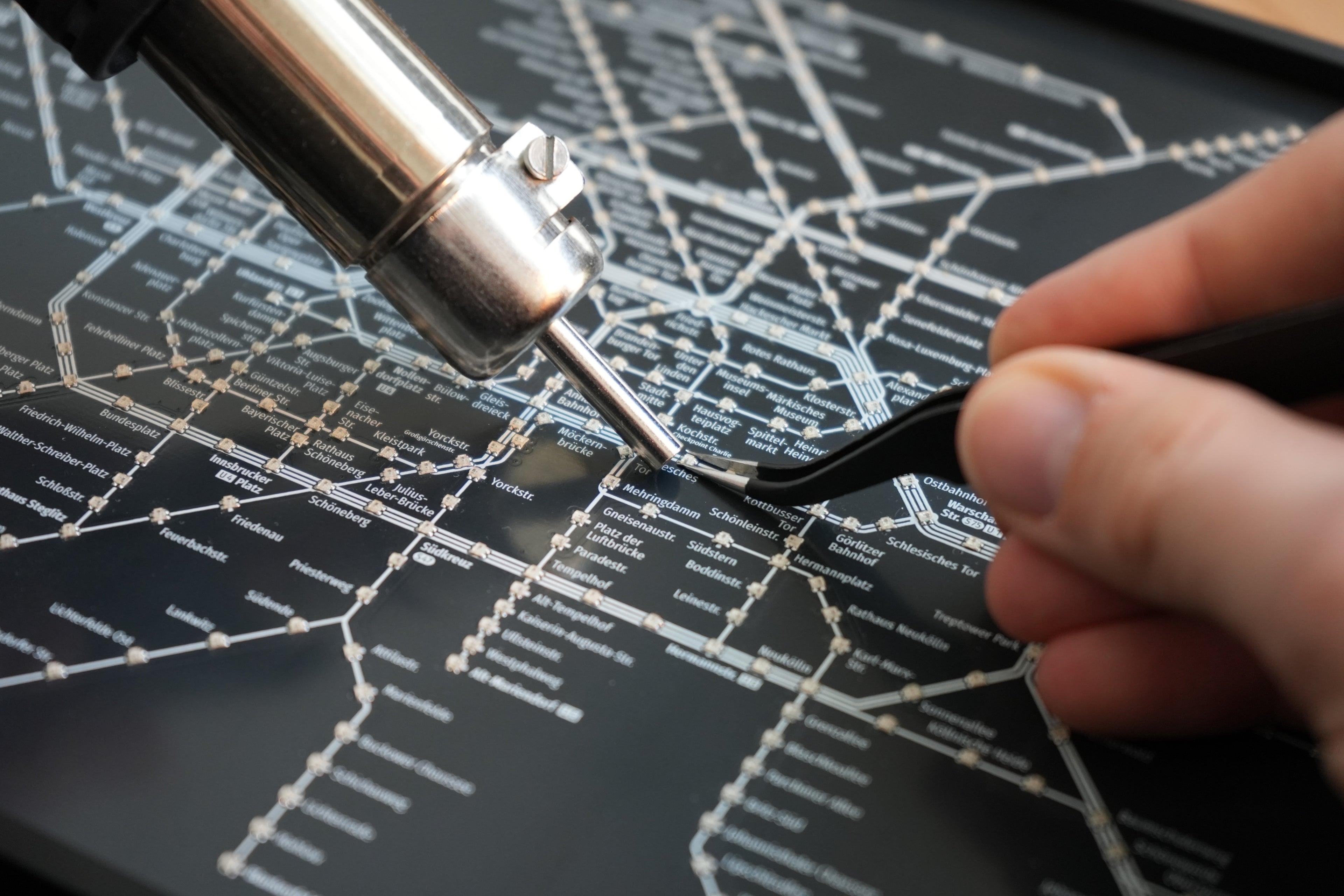 Ich kannte Zug-Tracker-Platinen schon aus dem englischsprachigen Raum und habe mich länger erkundigt, ob es sowas auch für Berlin gibt – doch wurde nicht fündig. Als ich 2024 dann eine Kickstarter Kapagne entdeckt habe, bei der Metro-Systeme amerikanische Städte in elegant designter Aluminium-Optik mit Holzrahmen dargestellt wurden, wusste ich, das brauche ich auch für Berlin.